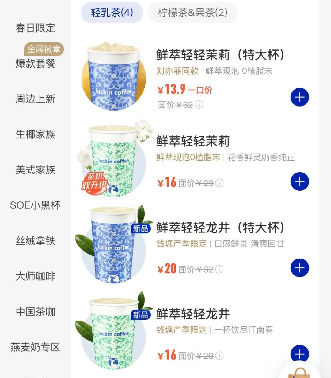 瑞幸輕乳茶,從一開始就藉助自研萃茶機“瑞掇菁”實現標準化生產,直接對標霸王茶姬的招牌產品“伯牙絕弦”,但價格更低(9.9元VS16元),或將衝擊霸王茶姬的市場份額。