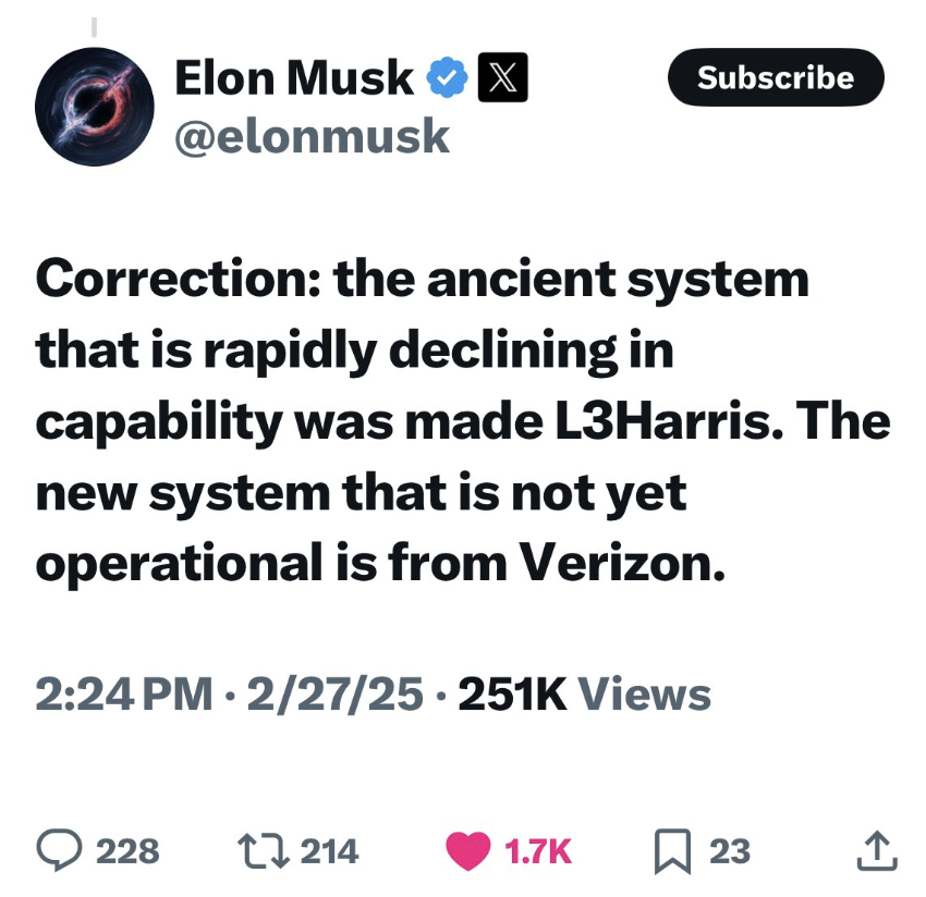 馬斯克將矛頭指向美國空中交通管制通信系統。該系統由Verizon公司負責,是航空運輸的“神經中樞”。
