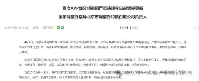2020年4月7日,國家互聯網信息辦公室指導北京市互聯網信息辦公室,針對百度APP多個頻道存在嚴重違規問題,嚴肅約談百度公司負責人,要求立即停止違規行為。百度APP推薦頻道、圖片頻道、視頻頻道、財經頻道、科技頻道自4月8日上午9時起暫停更新,清理違規內容,開展深入整改。