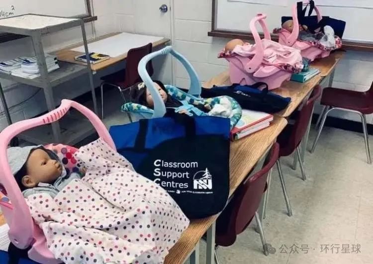 有些美國學校分發的“機器嬰兒”,讓學生24小時隨身照顧。機器嬰兒會按照新生兒的標準,定時哭鬧(包括半夜),亦需要餵食,檢查尿布(真的會尿),還會模擬各種生病,要插入對應的醫療卡來消除症狀。