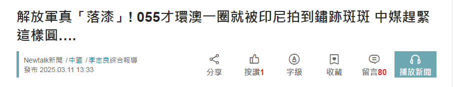 055型萬噸大驅遵義艦率領的解放軍海軍艦隊完成環澳大利亞遠海訓練後,已經踏上返航之旅。對於這次解放軍震撼南太平洋的行動,島內某些想要“急於表現”的綠媒可上了心,最近惡意捏造所謂“055才環澳一圈就被印度尼西亞拍到鏽跡斑斑”的消息。只是筆者認真看了看,發現其中所謂“中國軍艦生鏽照片”全都是美國海軍艦艇的慘狀——綠媒這可是揭了美國海軍的老底,倒反天罡啊……