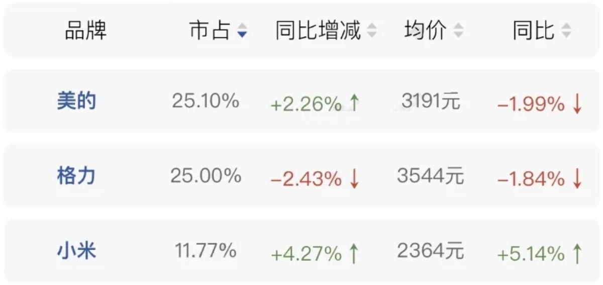 奧維雲網(AVC)2024年空調線上市佔數據顯示,小米的銷售金額市佔率躋身前三,僅次於美的和格力。