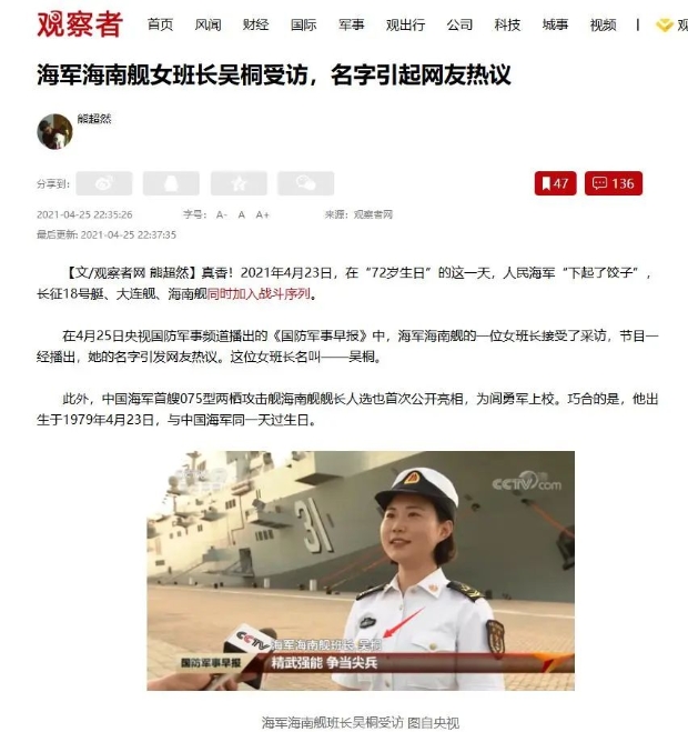 我記得當年075型兩棲攻擊艦首艦海南艦服役的時候,央七曾經採訪過海南艦上的一個女班長,而且相關報道一經播出就引起了廣大中國網友的熱議,因為她的名字叫吳桐。此外,海南艦首任艦長閭勇軍的有關情況也很引人注目,因為他的生日是1979年4月23日,和人民海軍正好是同一天過生日。