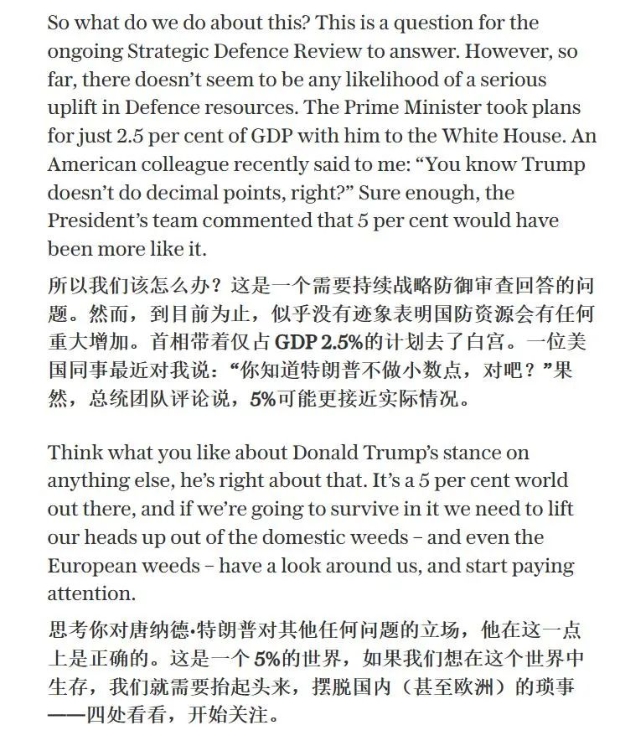 “我們到底該如何是好?這是一個擺在英國人眼前迫切需要回答的問題。然而遺憾的是,迄今為止,英國並沒有在軍事領域投入足夠多的國家資源。我們的斯塔默首相在去白宮面聖時,只帶了一份承諾要將英國的軍費開支提高到GDP的2.5%的計劃書。對此,我的一位美國媒體人同事最近是這麼調侃我的:‘懂王這人他不會看小數點的,這事你難道不知道?’果不其然,美國政府最後也説了,2.5%不夠,什麼時候你們英國願意提高到5%了,再過來和我們商量合作的事。”