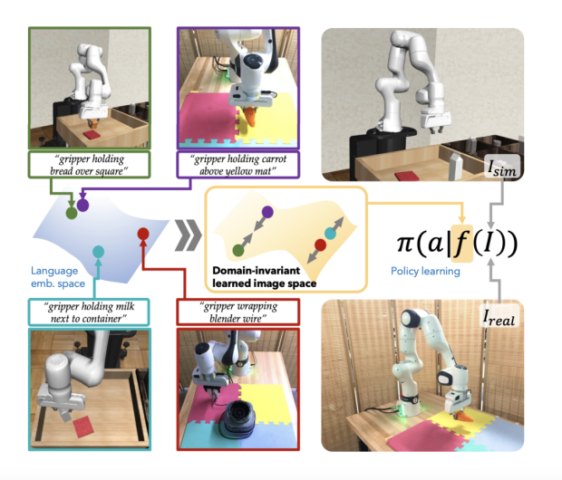 有研究就表明,在大語言模型的表徵空間內,相似的虛擬和現實的機器人操作圖像在表徵空間中更加靠近( 下圖中的綠框和紫框圖像 ),而不同的虛擬和現實的機器人操作圖像在表徵空間中就會離得更加遠( 下圖中的藍框和紅框圖像 )。