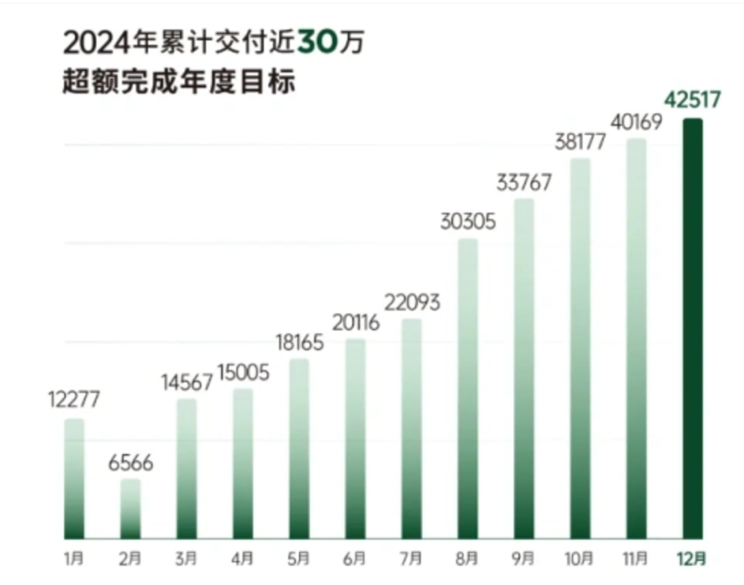 不但理想、賽力斯吃到了增程和主打家庭羣體的中大型SUV的紅利,2022年9月才港股上市的零跑汽車也靠C10和C11、C16三款模仿理想汽車(同時推純電+增程版),但性價比更高的車型實現了逆襲——2023年2月,零跑推出C11增程版,“要用30萬元-40萬元的配置體驗,重新定義15萬元-20萬元的汽車價值標準”。2023年零跑銷量達144155輛,同比增長超29%。2024年,零跑推出零跑C10(2024年1月)、零跑C16(2024年6月)兩大爆款,讓其銷量在2024年3月後開始節節攀升,2024年12月進入4萬輛/月高點,2024年銷量達29.37萬輛,同比增長103%。