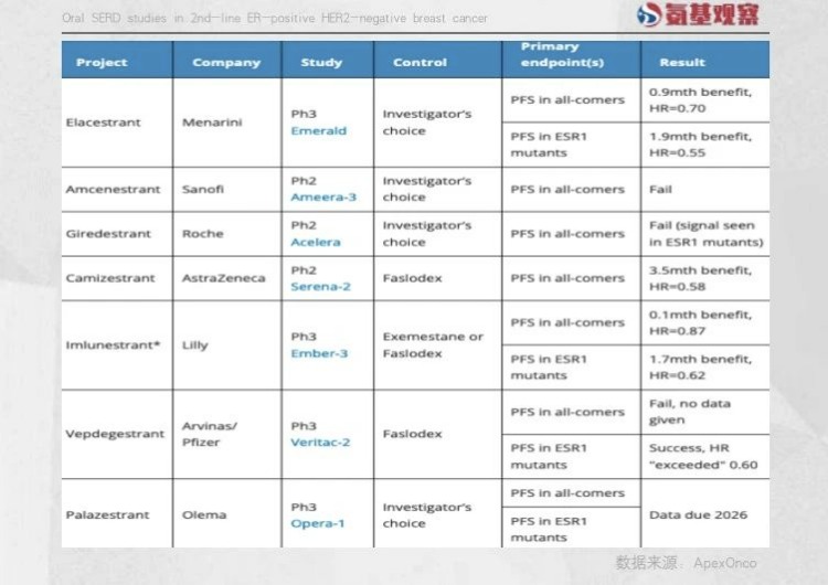 當前,第二代SERD藥物研發如火如荼,波折雖多,但成功上岸者也已經開始出現。例如,Menarini的elacestrant已經獲批,非頭對頭情況下,獲益似乎要比Vepdegestrant更出色。