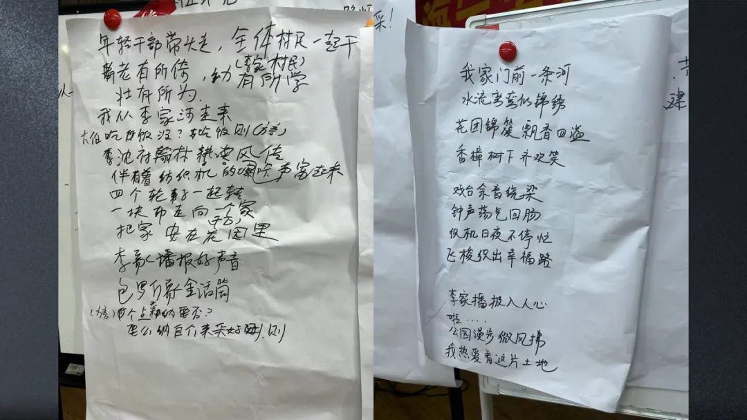 這時候會遇到一個問題,村民們想把村莊的方方面面,都寫在一首歌裏邊,比如説我們村莊南邊有什麼,北邊有什麼,東邊有什麼,西邊有什麼,但一首歌曲的容量是有限的。所以這時候大家會發生激烈的討論,用哪個詞或哪一句詞,有時候大家會吵起來,但這都是大家對村莊濃濃的愛,最後大家通過民主表決,來確定歌詞最終版本。這是經過大家討論之後,形成的《我從李家河走來》這首村歌的,主歌的歌詞版本。