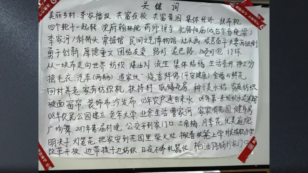 然後我們會請村民來分享自己跟村莊的故事,梳理村莊的文化和歷史,討論村莊發展的願景等等。在這個過程中,我們會讓村民抓取想用在歌詞裏的一些關鍵詞,這是當時做工作坊的時候,村民討論出來的一些關鍵詞,然後再把這些關鍵詞發展成,一句一句的歌詞,再組成一段一段的歌詞。