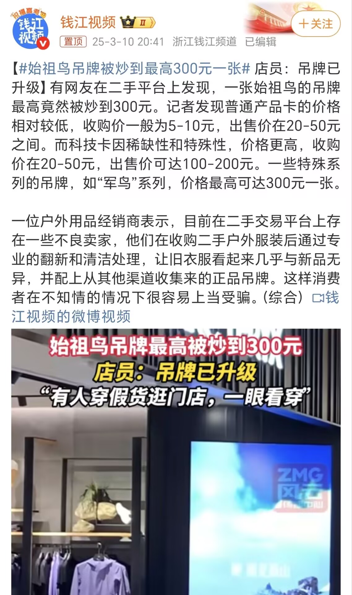 最近,近日,始祖鳥吊牌在二手平台被炒至300元的消息引發熱議。