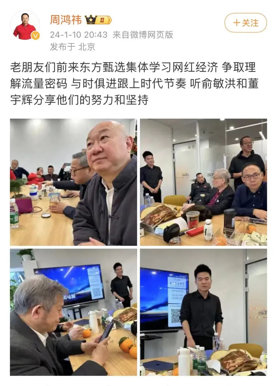 在《程前沒有“朋友圈”,大佬尋找新江湖》一文中,毒眸就已詳細梳理過企業家做IP的代表案例。比如“初代企業家網紅”俞敏洪就曾組局,帶着陳東昇、馮侖、周鴻禕等各界大佬來東方甄選現場觀摩互動,周鴻禕還發微博稱“老朋友們前來東方甄選集體學習網紅經濟,爭取理解流量密碼,與時俱進跟上時代節奏”