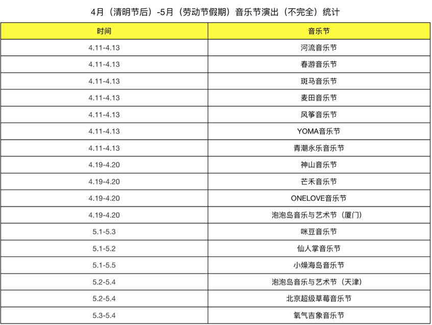 而音樂節逢長假必因人流巨大出現輿論風險的定律,也令不少音樂節主辦方選擇撤出混戰,但也同時造就了今年清明節假期後第一個雙休日多場音樂節扎堆的又一混戰現象。