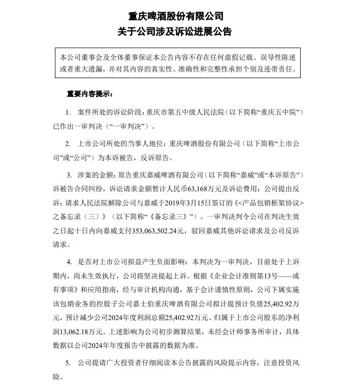 2023年12月,嘉威向重慶市第五中級人民法院提起訴訟,狀訴重啤違反包銷協議,訴訟請求金額高達6.31億元。