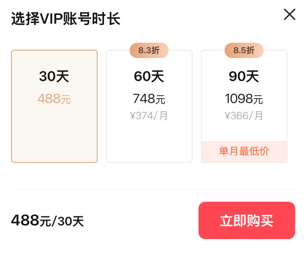 如果不選年框,開通單月 VIP 會員的話,一個月就是 488 元,同樣的,這個會員也包含了一部分權益,比如可以發佈三個競招崗位,每天有 60 個溝通權益。