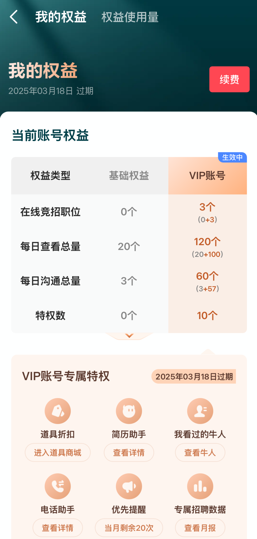 稍微解釋下,所謂的 VVIP 賬號裏面包含了崗位發佈、主動開聊等權益,搜索暢聊卡則是在 30 天內可以使用 40 次溝通權益,方便找人。