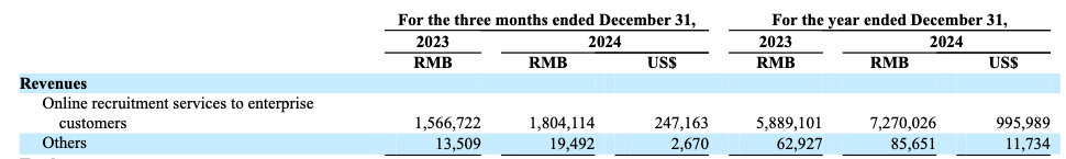 以 2024 年為例, 73.557 億的營收裏,企業客户的在線招聘收入有 72.7 億,佔到了整體營收的 98.8% 。 “ 其他 ” 佔的份額,幾乎可以忽略不計。