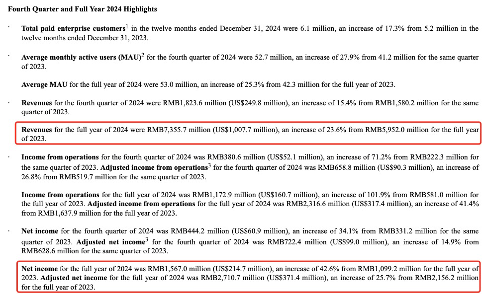就前兩天, Boss 直聘公佈了 2024 年的財務數據,去年一整年, Boss 直聘營收 73.557 億元,同比增長 23.6% ,淨利潤 15.670 億元,同比增長 42.6% 。