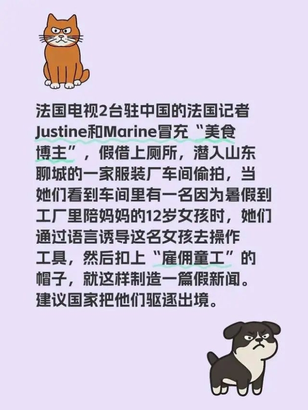 導致了這出鬧劇的禍根就是那段視頻。在視頻中,兩個法國記者通過不可告人的手段,偷偷潛入了山東聊城陽穀縣的一家服裝廠,然後通過非法盜攝、惡意引導、栽贓構陷和胡説八道等手段,在法國的輿論場上,強行給這家中國服裝廠安上“強迫勞動”等莫須有的罪名,致使這家服裝廠的法國合作方迪卡儂一時間陷入了被法國人千夫所指的窘境。迪卡儂為了自保,只好解除了和中國承包商之間的合作關係,此舉直接導致了那家聊城服裝廠關門大吉,也害得當時被那倆法國記者給誘騙的服裝廠工人丟掉了工作