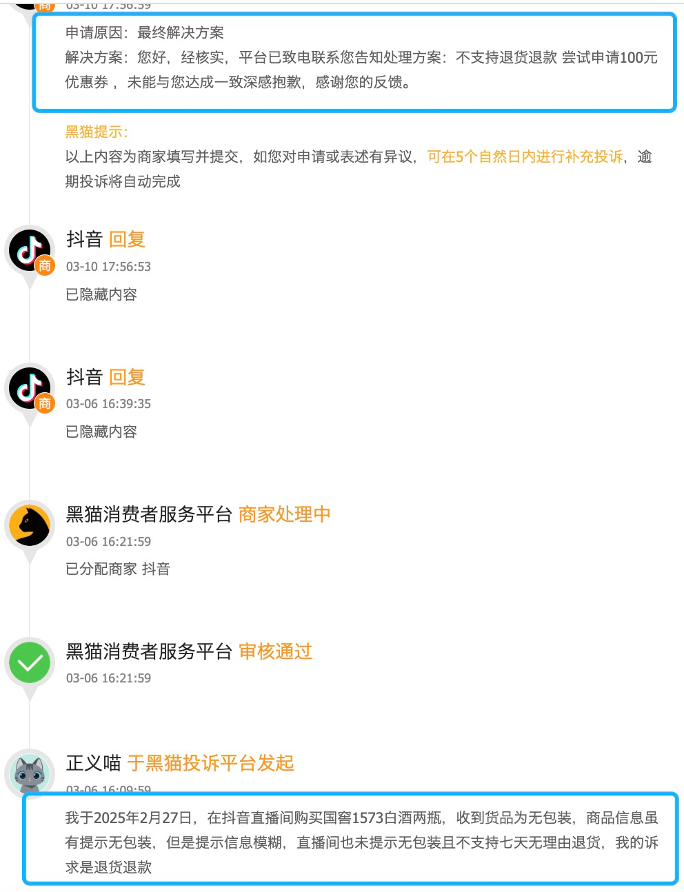 在黑貓投訴等消費者第三方平台上以“直播”“白酒”為關鍵詞進行搜索,可以看到不少消費者發起的投訴。比如,有網友投訴稱,其在抖音直播間購買的國窖1573產品,收到的貨品不僅無包裝,且不支持7天無理由退貨。該消費者投訴後,最終的解決方案也是無法退貨退款,僅以100元優惠券作為補償,但該該消費者未接受這樣的補償方案。
