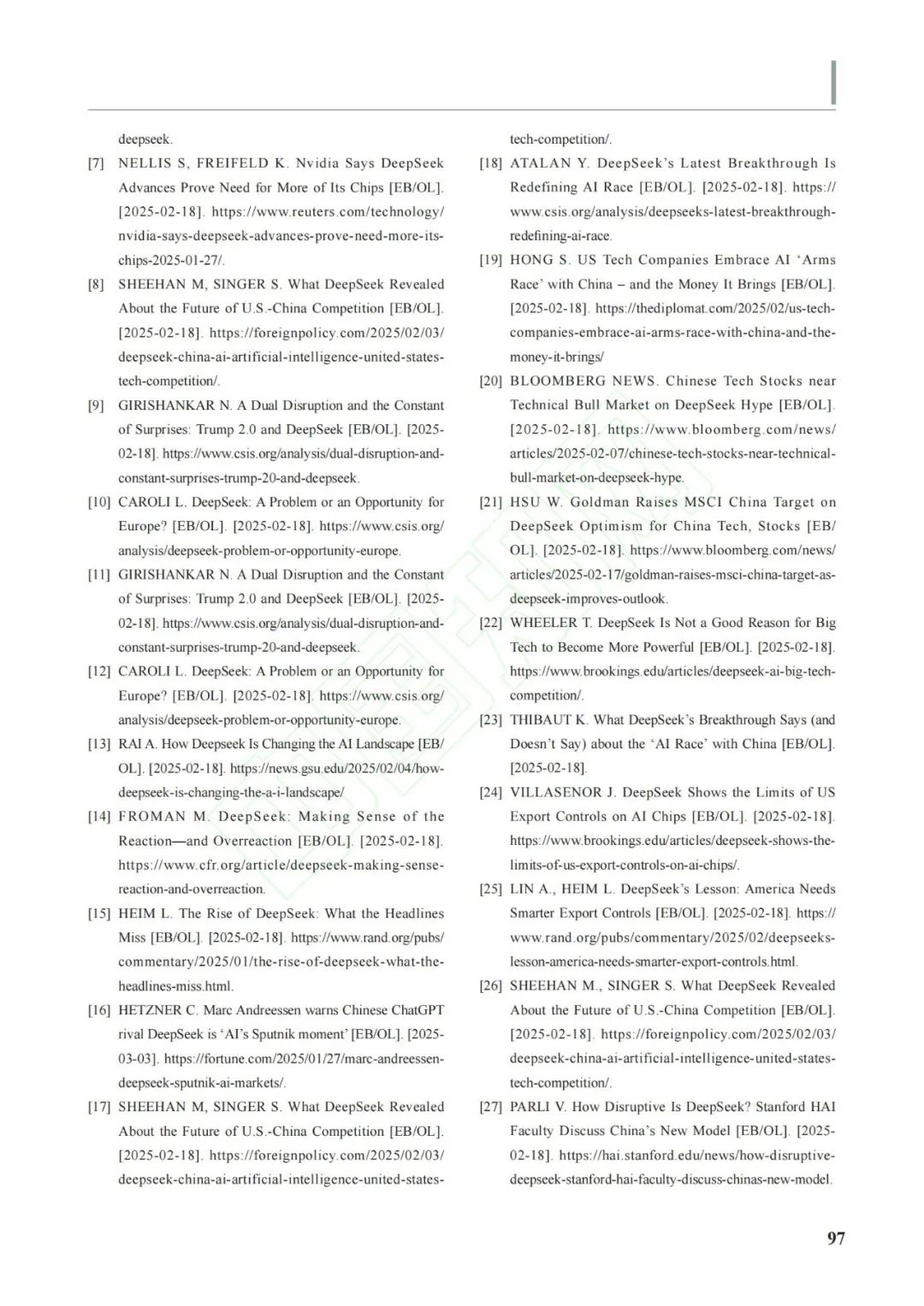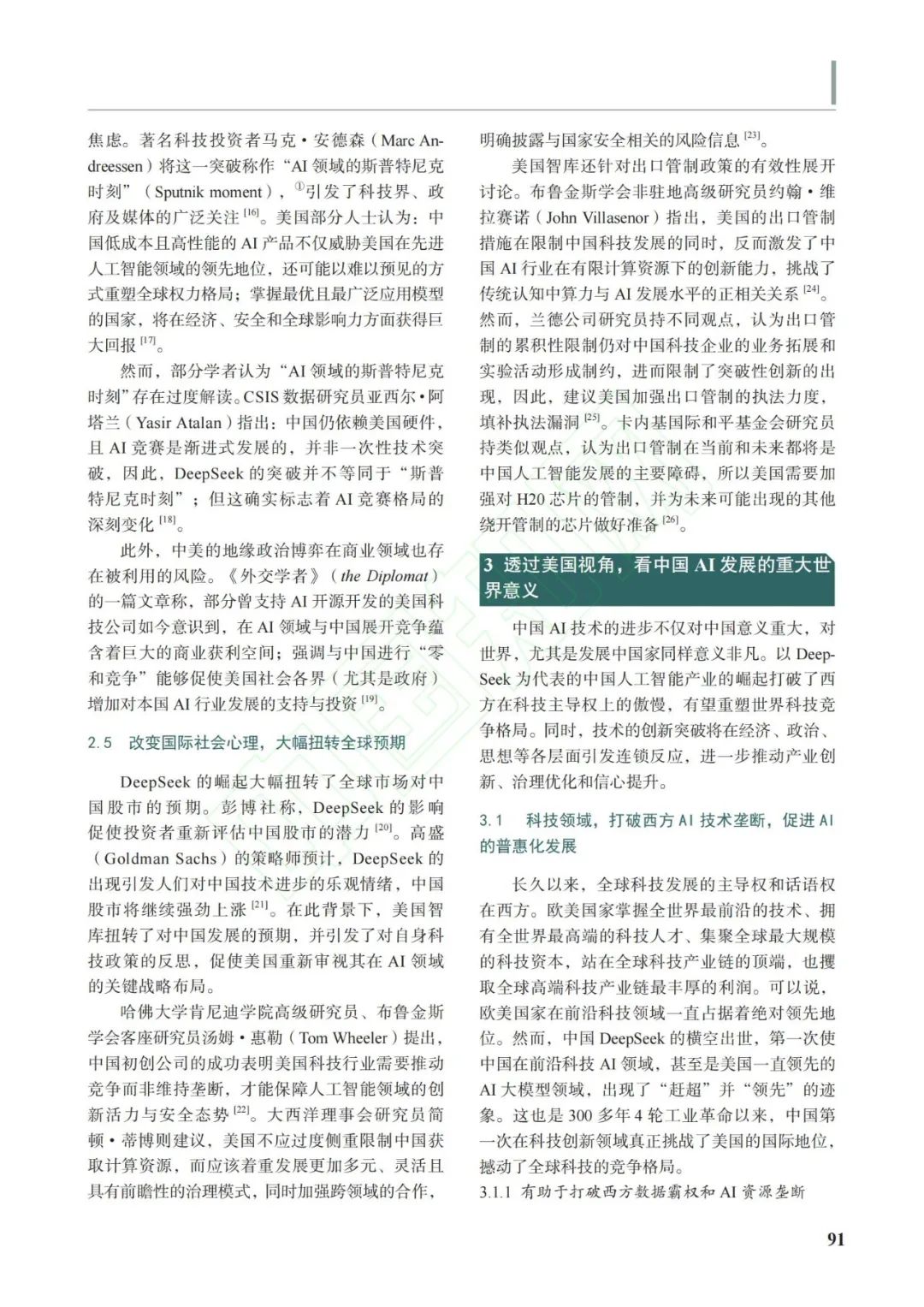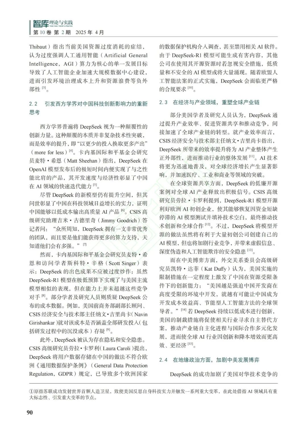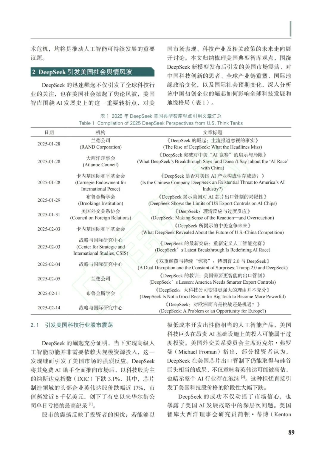 2025年1月,中國人工智能(Artificial Intelligence,AI)產品DeepSeek一經發布,便震驚世界,尤其是引起了美國的極大關注。美國社會各界尤其是智庫迅速展開對DeepSeek的深入分析與評估,引發了美國科技界及社會的廣泛討論與反思。儘管存在部分質疑聲音,但更多評價聚焦DeepSeek所展現的技術突破與創新價值,“AI的斯普特尼克時刻”“卓越的AI進展”等言論頻現美國輿論之中,充分體現了美國社會對中國人工智能發展的普遍認可。