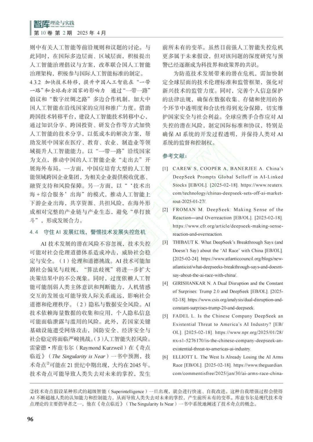 【目的/意義】2025年1月,我國初創公司深度求索(DeepSeek)發佈人工智能(Artificial Intelligence,AI)模型引發全球關注,尤其在美國引發了各界震動。DeepSeek產品的推出標誌着中國在全球科技競爭格局中的崛起,挑戰了美國硅谷的AI技術壟斷,不僅對中國意義重大,更在科技、經濟、政治、思想等領域具有重要的世界意義。