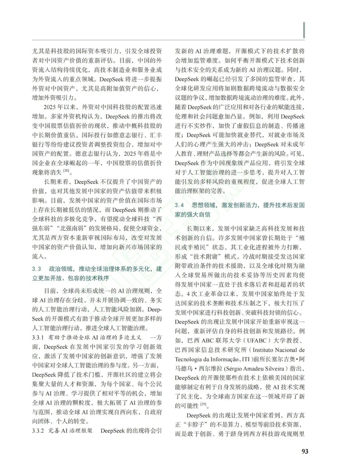 長期以來,發展中國家缺乏高科技發展和技術創新的自信。許多發展中國家曾長期處於“殖民或半殖民”狀態,其工業化進程被外力打斷,形成“技術附庸”模式。冷戰時期接受發達國家附帶政治條件的技術援助,以及全球化時期為融入全球貿易所做出的技術妥協等歷史因素均使得發展中國家一直處於技術落後者和趕超者的狀態。4次工業革命以來,發展中國家始終處於發達國家的技術壟斷和技術壓制之下,極大打壓了發展中國家進行科技創新、突破科技封鎖的信心。DeepSeek的出現讓發展中國家開始重新審視這一問題,重新評估自身的科技創新和發展路徑。例如,巴西ABC聯邦大學(UFABC)大學教授、巴西國家信息技術研究所(Instituto Nacional de Tecnologia da Informação,ITI)前所長塞爾吉奧·阿馬德烏·西爾維拉(Sérgio Amadeu Silveira)指出,DeepSeek的開源使那些在技術上依賴美國的國家能夠制定有利於自身發展的戰略,使AI技術實現了民主化,為全球南方國家在這一領域開闢了新的可能性。