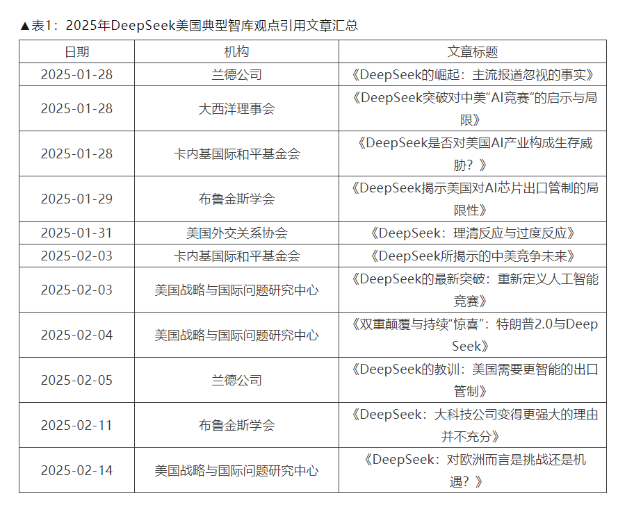 DeepSeek的迅速崛起不僅引發了全球科技行業的關注,也在美國社會掀起了輿論風波,美國智庫圍繞AI發展史上的這一重要轉折點,對美國市場表現、科技產業及相關政策的未來走向展開討論。本文歸納梳理美國典型智庫觀點,圍繞DeepSeek新模型發佈後引發的美國市場震盪、對中國科技創新的思考、全球產業鏈重塑、國際地緣政治變化,以及國際社會預期變化,深入分析該中國初創企業的崛起如何影響全球科技發展和地緣格局(表1)。