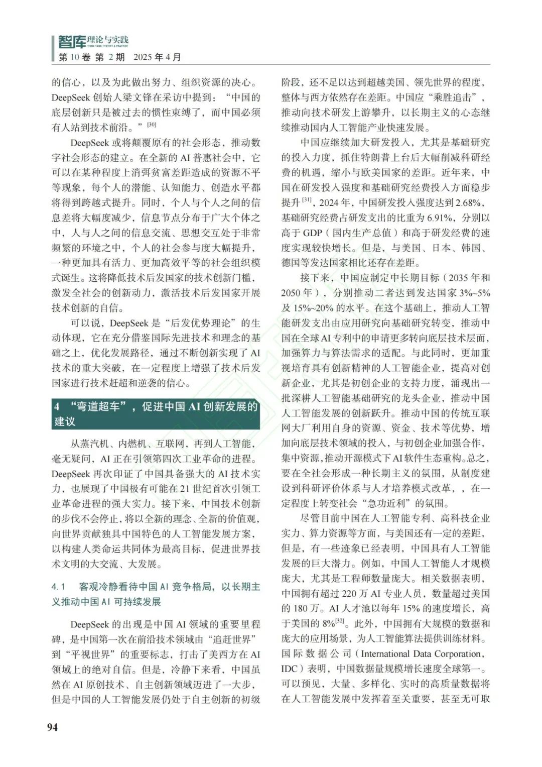 **儘管目前中國在人工智能專利、高科技企業實力、算力資源等方面,與美國還有一定的差距,但是,有一些跡象已經表明,中國具有人工智能發展的巨大潛力。**例如,中國人工智能人才規模龐大,尤其是工程師數量龐大。相關數據表明,中國擁有超過220萬AI專業人員,數量超過美國的180萬。AI人才池以每年15%的速度增長,高於美國的8%。此外,中國擁有大規模的數據和龐大的應用場景,為人工智能算法提供訓練材料。國際數據公司(International Data Corporation,IDC)表明,中國數據量規模增長速度全球第一。可以預見,大量、多樣化、即時的高質量數據將在人工智能發展中發揮着至關重要,甚至無可替代的作用。算力的發展具有瓶頸,大量的電力能源消耗、土地資源消耗均對算力擴展和性能提升形成制約,一味追求算力提升的人工智能發展路徑不可持續。然而,數據的潛力是無限的,高質量的數據可以與算力、算法形成協同,DeepSeek的開源模式更是釋放了數據的無限潛力。預計2030年中國人工智能發展將超越美國,引領第四次工業革命的進程。