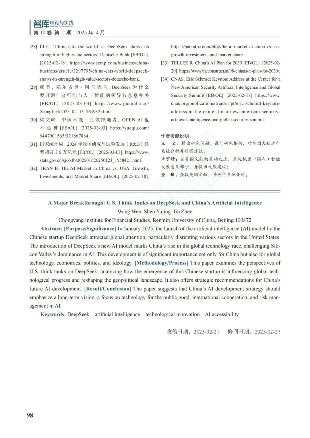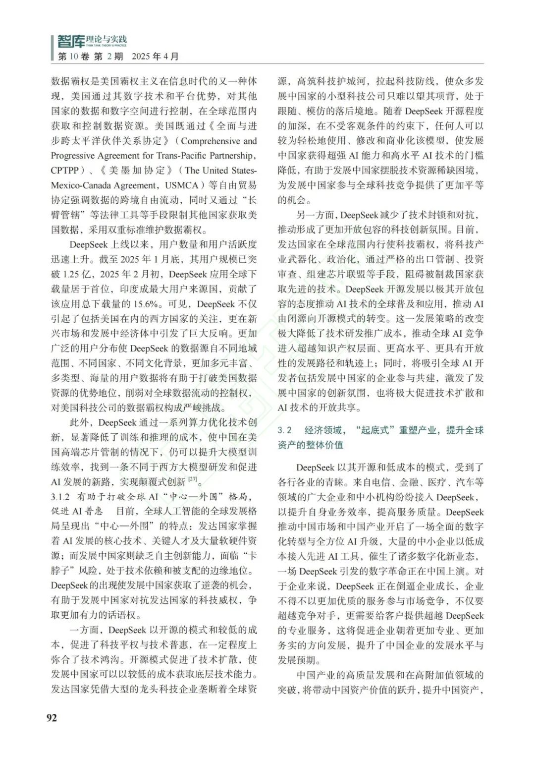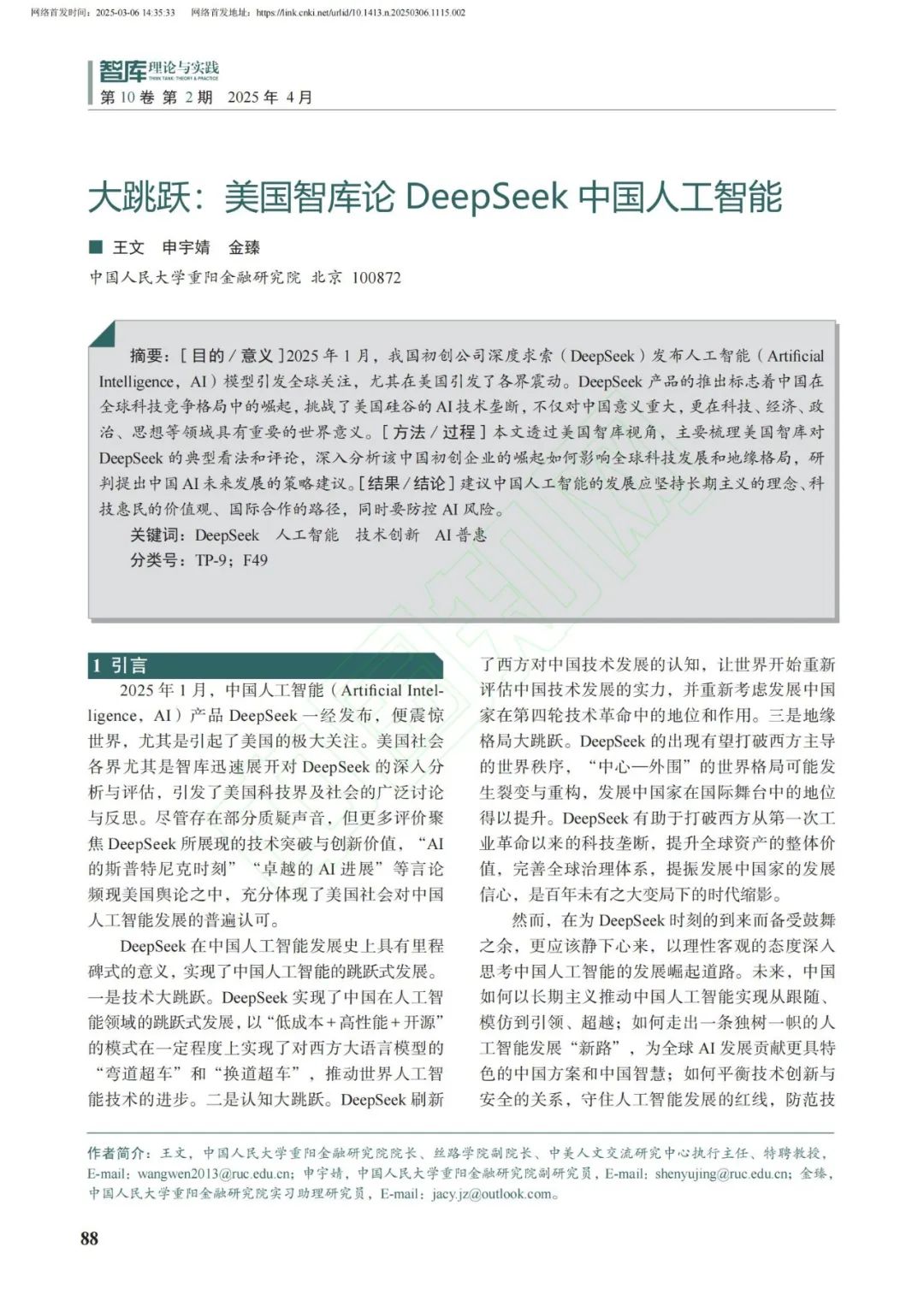 編者按:2月23日,“DeepSeek中國人工智能、跳躍式發展與全球2050目標”主題研討會發佈了《大跳躍:美國智庫、媒體與行業論DeepSeek中國人工智能》研究報告,引起廣泛關注。該報告論文版近日在核心期刊《智庫理論與實踐》2025年3月第10卷第2期發佈(作者系人大重陽院長王文、副研究員申宇婧、助理研究員金臻)。現將論文全文發佈如下: