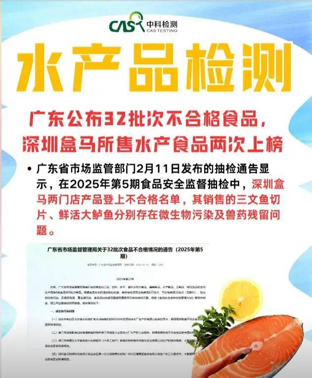 2月11日,廣東省市場監管部門發佈的抽檢通告顯示,在2025年第5期食品安全監督抽檢中,深圳盒馬網絡科技有限公司兩門店產品登上不合格名單,其中寶安區第一分公司銷售的“三文魚切片”檢出大腸菌羣超標,寶安區第二分公司銷售的“鮮活大鱸魚”則檢出獸藥恩諾沙星殘留量超標。