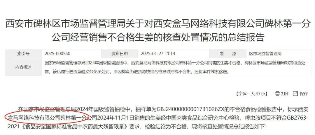 1月27日,西安碑林市場監督管理局通報,西安盒馬網絡科技有限公司碑林第一分公司於2024年11月銷售的部分生薑產品不合格,被責令改正。