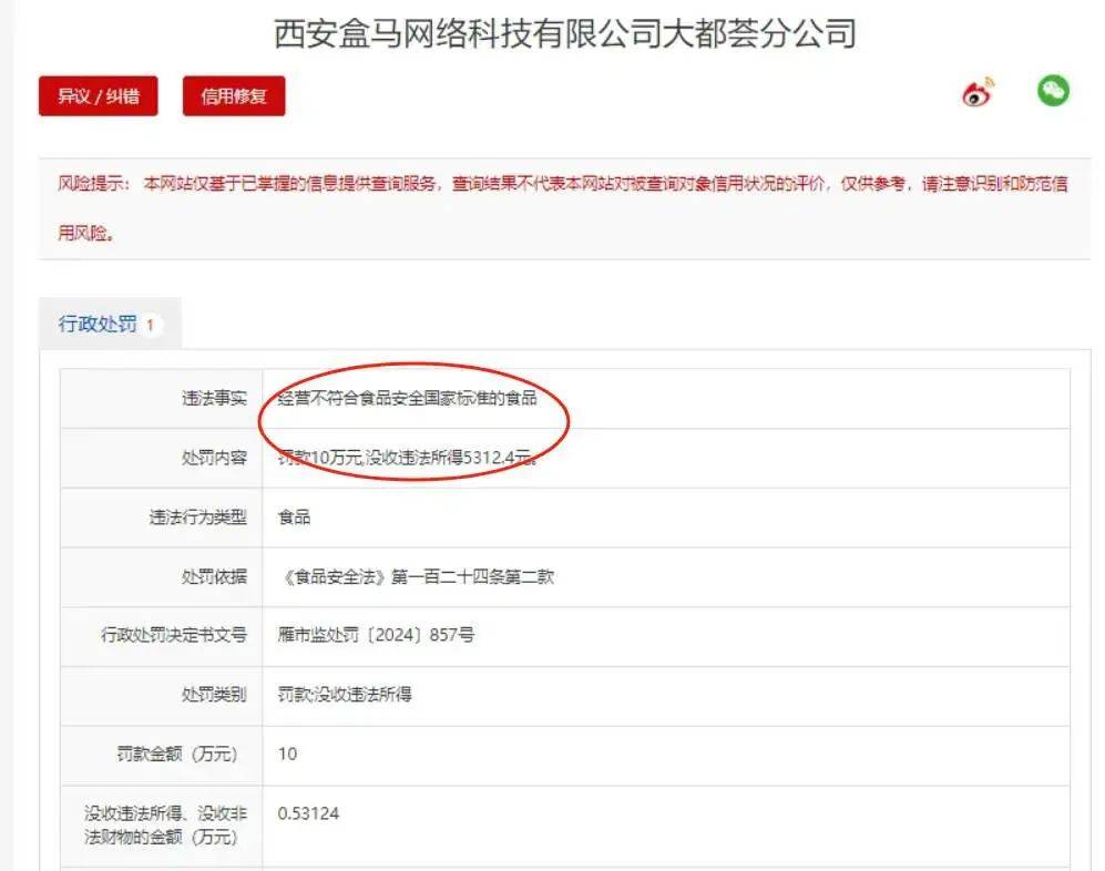 2月24日,西安市雁塔區市場監督管理局公佈一則行政處罰決定書,西安盒馬網絡科技有限公司大都薈分公司因經營不符合食品安全國家標準的食品,被依法處以罰款10萬元,並沒收違法所得5312.4元。