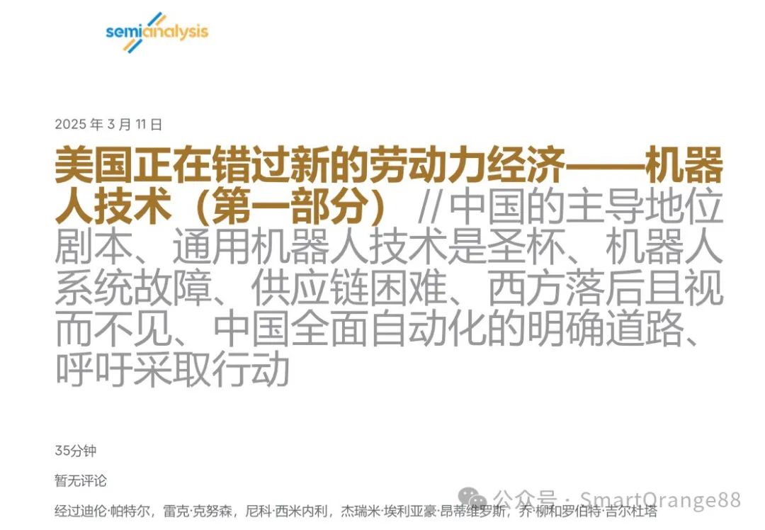 第2個是今天Semianalysis發了一篇機器人的檄文《America Is Missing The New Labor Economy – Robotics Part 1》…文中對技術的介紹並不多,更多是從中美國家戰略對比、中美機器人產業鏈控制權之爭以及意識形態角度做了宏觀敍事。