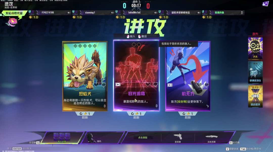 這個階段你可以和隊友溝通選擇某張卡牌,如果你對隨機刷出來的卡牌不滿意,也可以用碎片卡點數來刷新新卡牌出來。或者一個點數都不用打把 Eco 局,等點數資源多了,在某局中全壓上,一次激活多張卡牌效果。