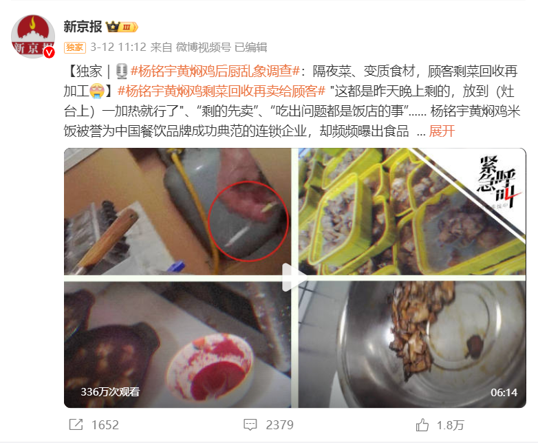 前兩天,新京報記者曝光,楊銘宇黃燜雞部分門店出現剩菜回收、變質食材、無證上崗等亂象,一石激起千層浪,不少愛吃黃燜雞的網友表示天塌了。