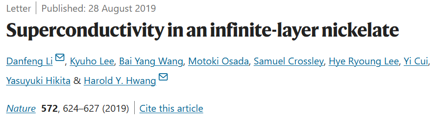 直到2019年,斯坦福大學的Harold Y. Hwang教授利用CaH2拓撲化學還原的方法在鎳基薄膜 Nd0.8Sr0.2NiO2中發現了 9—15 K 的超導電性,文章發表在nature上。