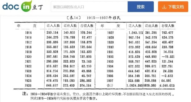 1:在1894年-1911年的清末時期,由於甲午戰爭戰敗清政府擔心失去東北控制權,因此大量放開和鼓勵闖關東移民,這15年間東北人口從大約700萬猛增到大約1800-1900萬人,人口基數很小的情況下增加了超過1000萬人,平均每年增長大約70多萬人。