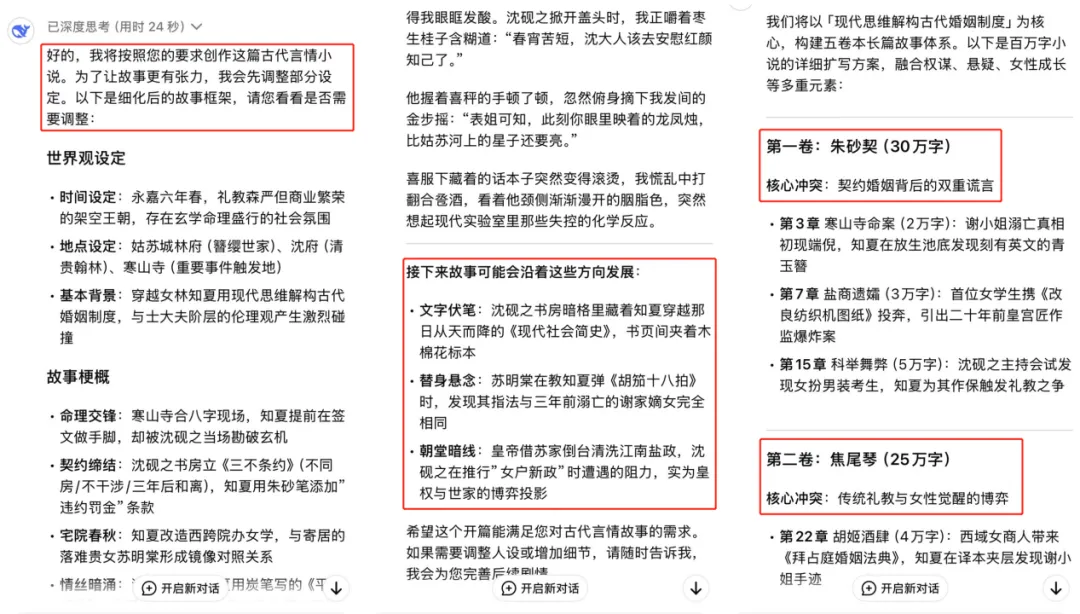 自從DeepSeek橫空出世過後,因其在特定任務中的順序推理能力(如鏈式思維),有着十多年網文閲讀經驗的朝夕,原本以為上述問題可以靠給AI喂人工故事大綱、不斷細化情節要求以自動生成來解決,但她試驗的結果卻並不怎麼令人滿意。