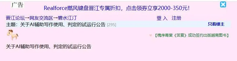 2月17日晚,晉江文學城站長iceheart在碧水江汀論壇發佈了《關於AI輔助寫作使用、判定的試行公告》,對AI寫作輔助中的文字型輔助和創意性輔助進行分類,劃分等級。一旦超過一定範圍,影響原創性,則不可使用AI。若超出允許範圍的AI輔助寫作情形,則面臨鎖章、永久禁榜等處罰。