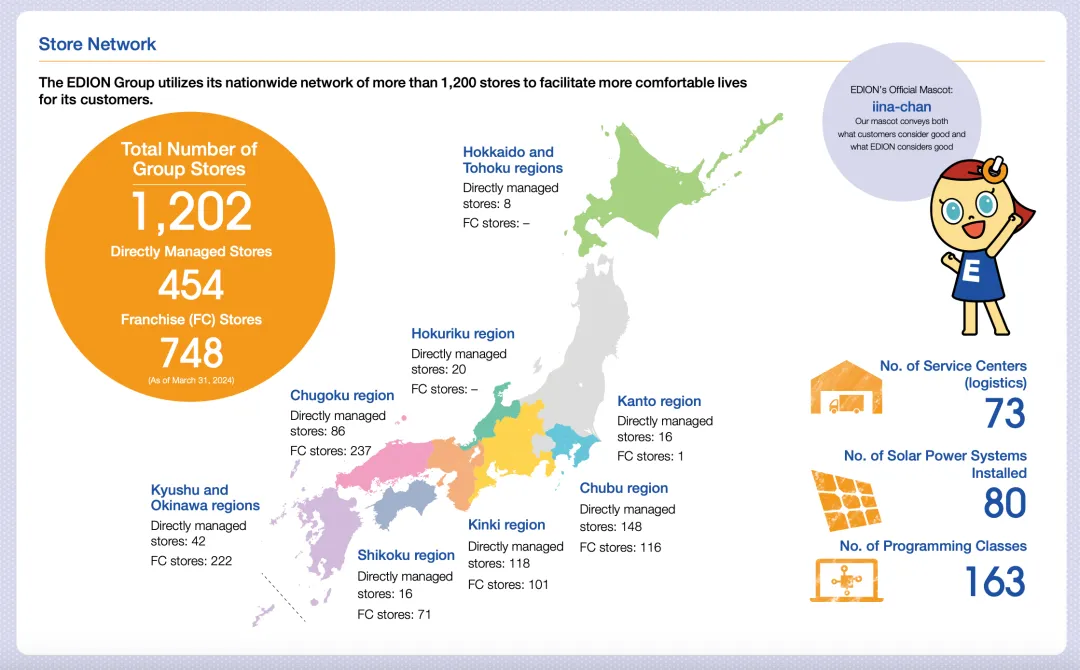 在其官方資料中,EDION愛電王這樣自我介紹:“愛電王以良好的售後、優惠的價格、豐富的貨品渠道多年來穩居日本家電量販連鎖TOP3之列。”而財報顯示,截至2024年3月底,EDION愛電王在日本一共擁有1202家門店,其中454家為直營店,748家為加盟店,會員卡(擁有信用卡功能)持有者共483萬。