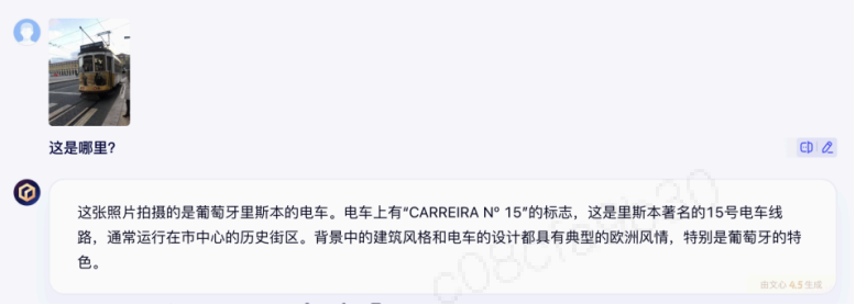 文心大模型4.5可以準確根據照片中電車的標誌,準確判斷出照片拍攝於葡萄牙里斯本。