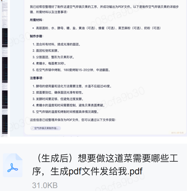 GPLP犀牛財經通過文心一言4.5上傳一張美食照片,並提問“想要做道菜需要哪些工具,並生生PDF文件發給我”,在15秒內秒便給出準確的答案及生成PDF文件。
