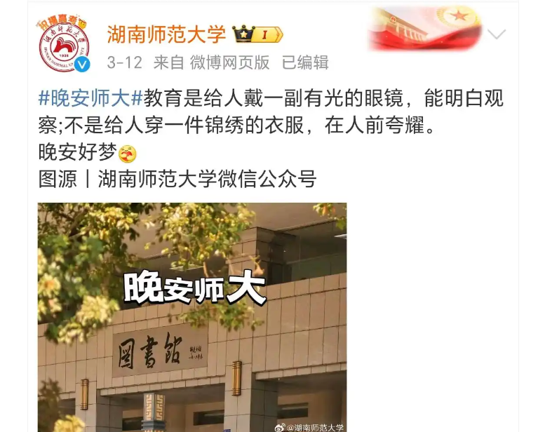 “教育是給人戴一副有光的眼鏡,能明白觀察;不是給人穿一件錦繡的衣服,在人前誇耀”,這是2025年3月12日湖南師範大學官方微博的一條晚安祝詞。然而就是如此簡單一句話,因為是胡適説的,竟意外掀起一場輿論風波。一些人對湖南師範大學口誅筆伐,指責校方“美化反動文人”,甚至集體向上舉報。在一片聲討中,湖南師大不得不妥協,刪除了 “胡適” 二字,僅保留原文。這場荒誕的輿論鬧劇,恰似一面魔鏡,折射出當下社會輿論場中 “因人廢言” 的非理性亂象。