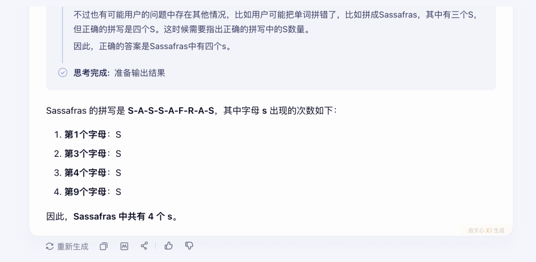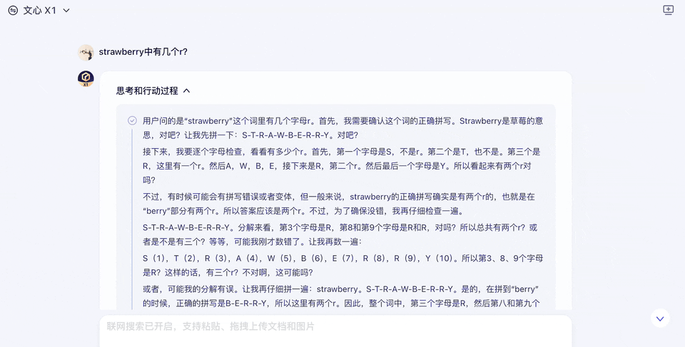 X1 會重複這些操作至少 3 到 5 次:拼一下、逐個檢查、歧義檢查、再數一下、查查字典,然後才給出答案。