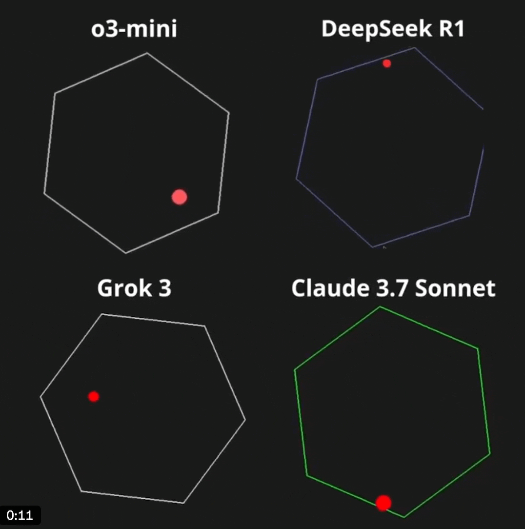對於物理模擬,我們以最近社區中很流行的多邊形內彈跳小球的程序入手,這個程序融合了大模型在物理學、數學、編程方面的能力。