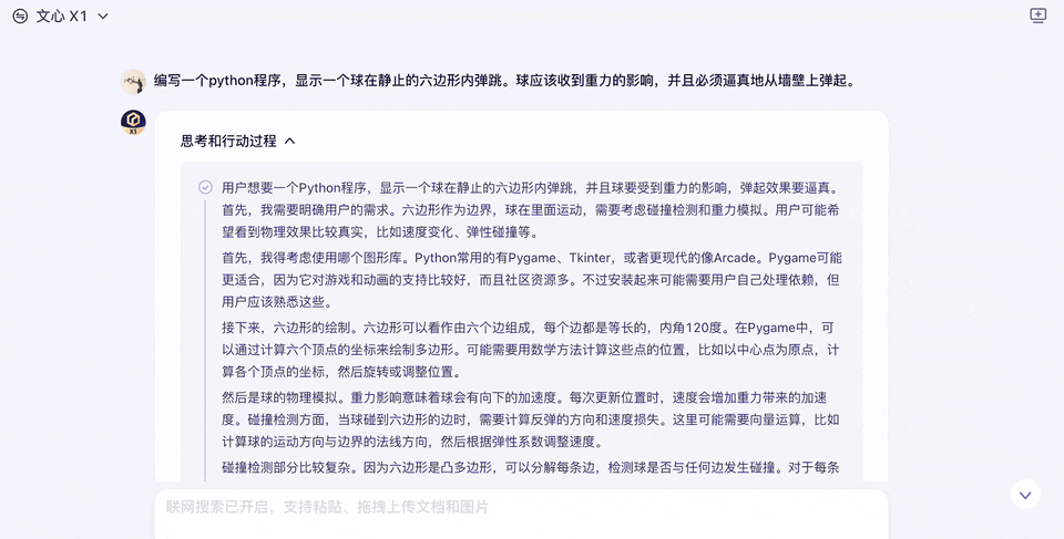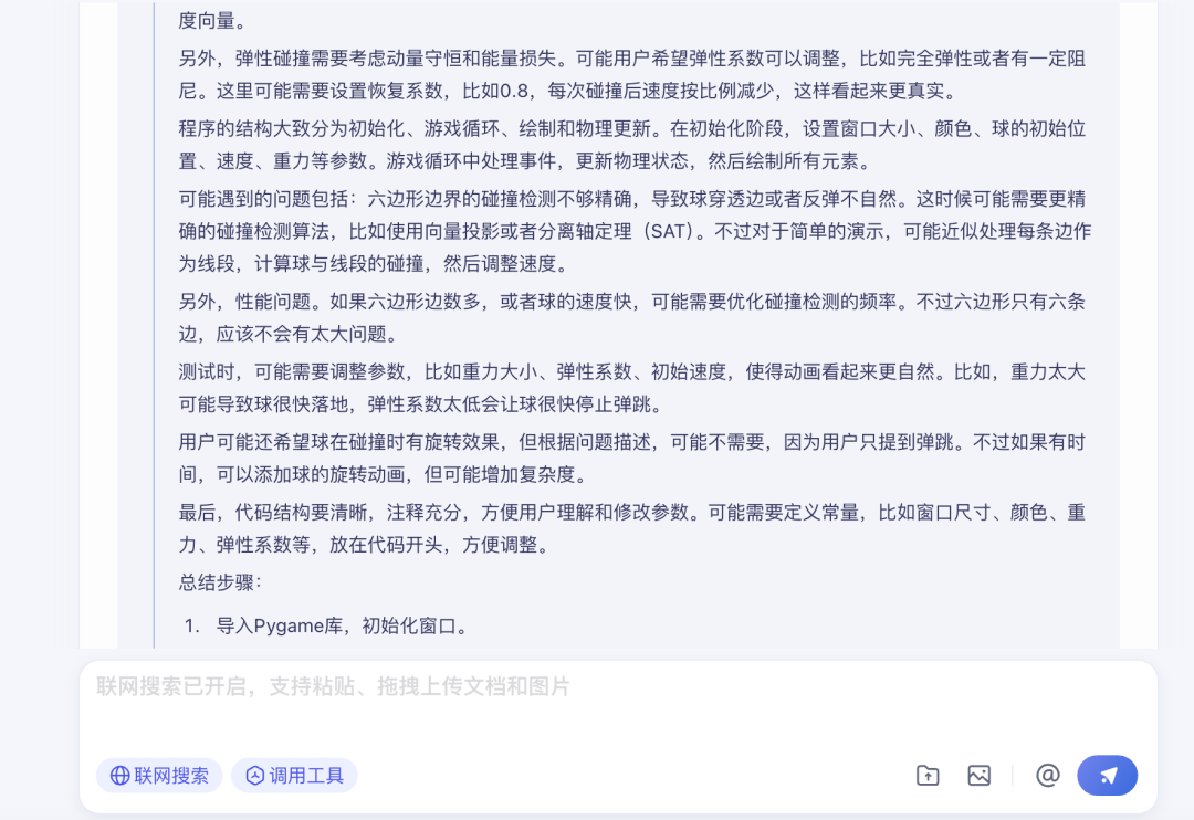 並且,X1 在思考時也特別謹慎,比如會從需求展開去詳細考慮可能的工具( 比如pygame、tkinter )、可能要考慮的因素( 比如旋轉、摩擦、彈性係數、球穿透邊、反彈不自然 ),然後再去反思題目設置,捨棄不必要的因素,這樣對確保邏輯嚴密性、不遺漏需求點應該是很有好處的。