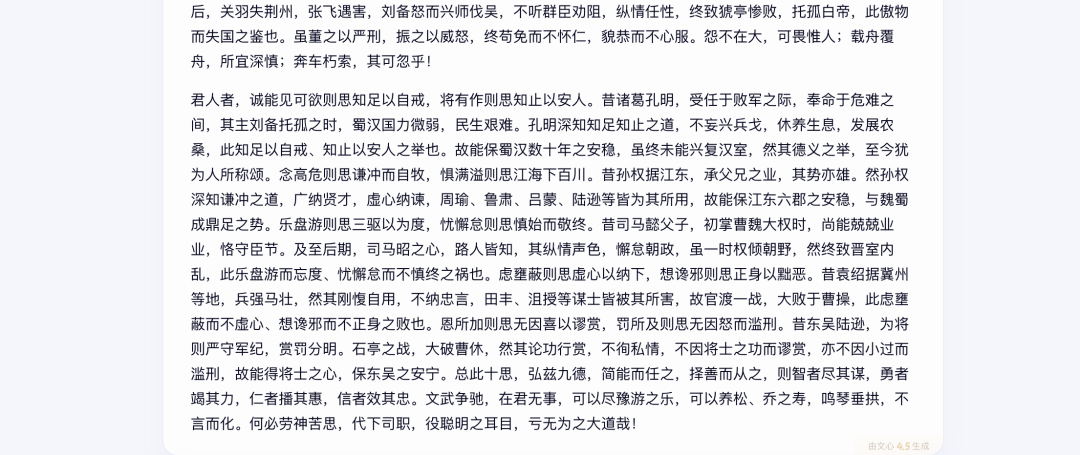 可以看到,文心-4.5在成文中將原本各朝各代的事例替換為大量三國時期的事例,並遵循了《 諫太宗十思疏 》的反思基調,都是反面警醒的類型。對原文中精簡的十思,文心-4.5都補充了同一時期的正面案例來進行説明。這種改寫能力已經超出了高中生的水平。