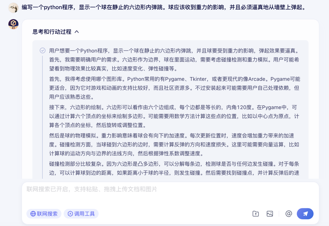 總體來看,X1 的推理嚴謹、善於自查,在物理過程理解上比較全面,但有一定概率結合不到代碼中,推理和代碼能力通過步驟拆解能有所補足。思維鏈的展開特別慷慨,對於教育培訓場景很實用,只是需要解決一下重複推導的問題,而對於實際生產和收益可能帶來過量的時間損耗。