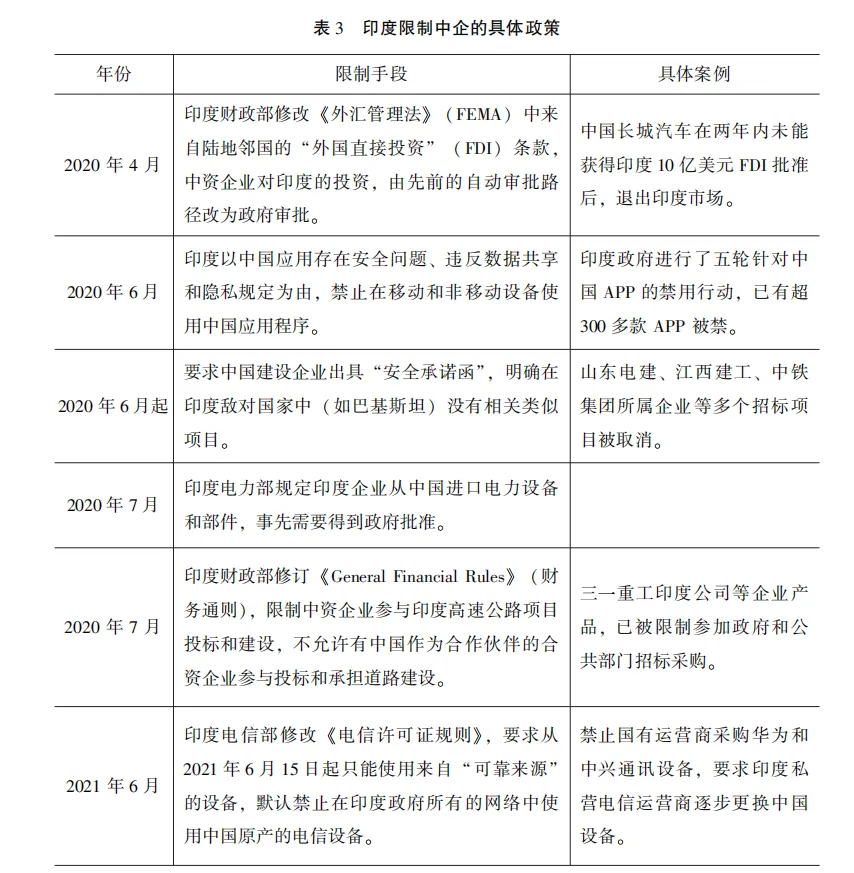 第一,印度政府部門修改或出台新規,限制中國企業在印度的活動。如表3所示,印度政府慣用“泛安全化”手段,禁止或限制中企在印投資和生產,迫 使中企離開印度市場,給中國企業造成了巨大損失。