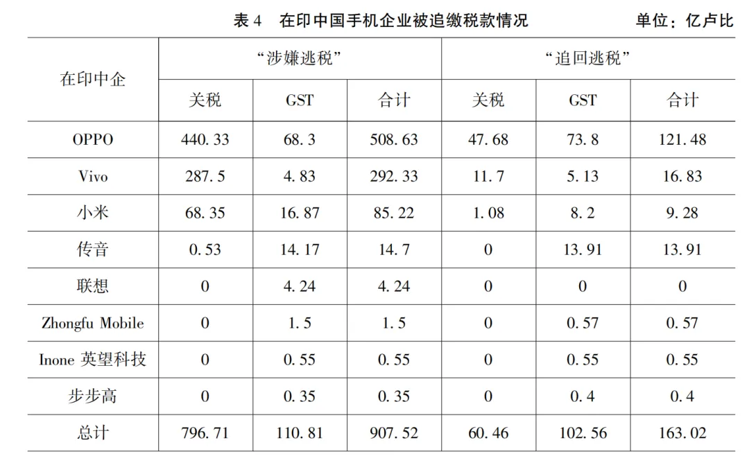 第三,印度税務部門經常對在印中企開展大規模進駐式税務稽查,尤其將中企作為重點審查對象。由於印度沒有統一完善的外資管理制度和税收制度,給印度稽查機構提供了針對中國企業“合規審查”的空間。尤其中印關係降温後,以在印中國手機品牌企業為例(見表 4),印度税務部門常常以外匯管理和税務問題對其進行“突擊稽查”並開具“天價罰單”。近年來,印度對在印中企的懲罰行動不斷升級,不僅限於税務稽查和罰款,還包括指控其涉嫌洗錢、欺詐、逃税及經營空殼公司等行為。2023年12月,Vivo印度子公司兩位高管和一名顧問以涉嫌違反印度《防止洗錢法》為由被捕。2024年初,印度執法局(Enforcement Directorate)在新德里、昌迪加爾、哈里亞納邦、旁遮普邦和古吉拉特邦的19個地點進行了突擊搜查,調查中資金融科技公司涉嫌洗錢的活動。上述嚴苛的税務稽查活動,不僅影響了印度的投資環境,還傷害了中印兩國經貿合作的信心。